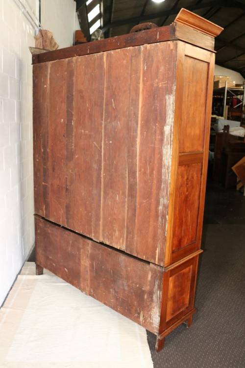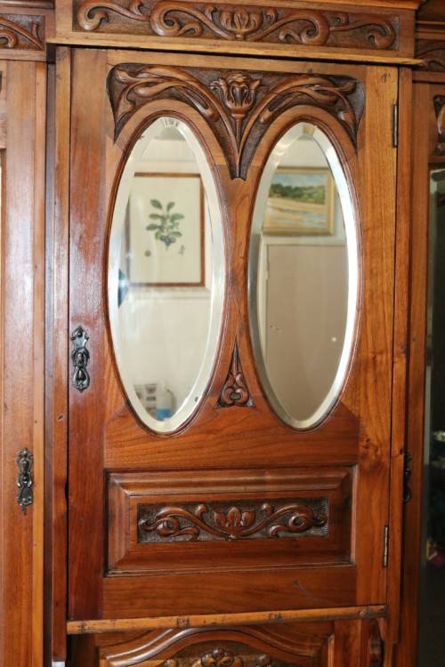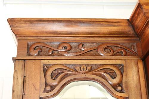This spectacular and very large (oversized) antique Victorian, early-Art Nouveau (c1890) three-door "Armoire" wardrobe/ cabinet is an incredible find and a seriously magnificent piece of furniture. The wardrobe is extremely heavy, well made and has loads of character. This incredible wardrobe measures a very sizeable 164cm long x 64cm wide x 236cm high. The wardrobe features an amazing deep cornice top and the most incredible hand carved floral detailing throughout the design of the wardrobe - true to the Art Nouveau style. The wardrobe has wear and tear consistent with its amazing age but with that comes character that you will only find with a piece like this - it is over 120 years old! The wardrobe has three doors with bevelled glass "British Silvered Glass" mirrors (they have some signs of wear). One of the panels on the bottom left of the wardrobe is missing but it is not hugely noticeable. This wardrobe is truly something you don't see every day - it's magnificent! Please view the pics carefully to fully appreciate this spectacular wardrobe and to confirm the condition.