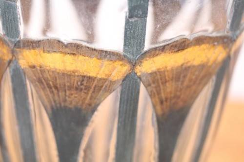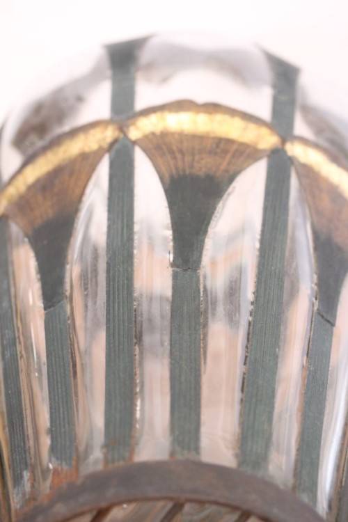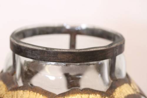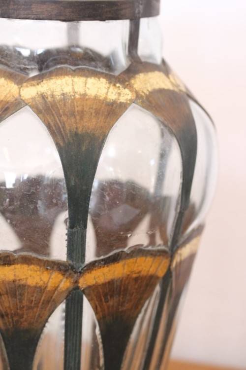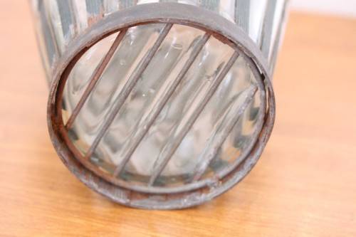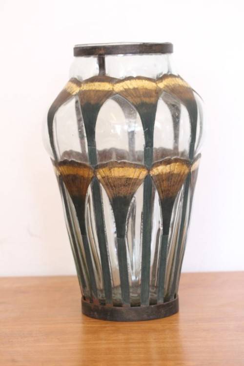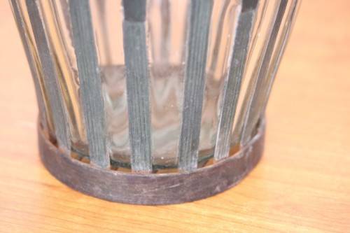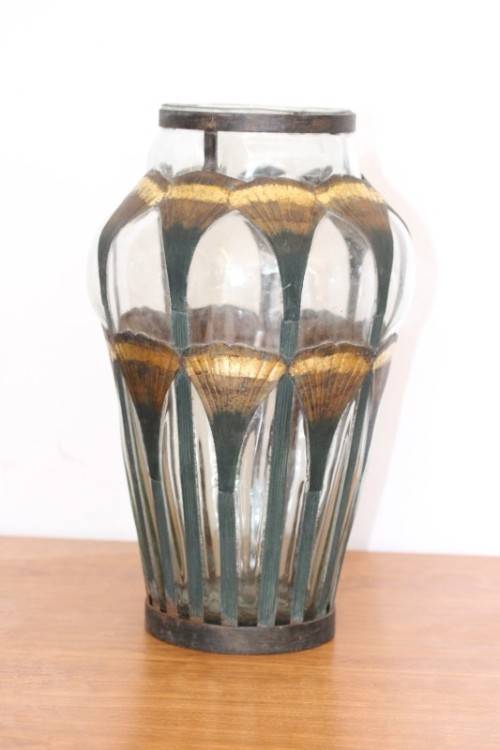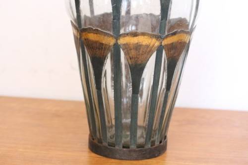 This extremely rare hand blown "caged" glass vase with a handmade and hand painted papyrus themed metal cage is truly an incredible find and an absolutely one of a kind piece. The vase measures 21cm across and is 35.5cm high. The technique used to create the vase has its roots as far back as the fourth century although this vase is most likely a mid-century (c1950) piece. Caged or "Imprisoned" glass" was made by welding metal (with diamond, square, or circle cutouts) into cylinders and blowing the glass into it. Many of the glass making countries of the world such as Italy and the now Czechoslovakia produced this style of glass in the early 1900's. There are no two pieces alike. The vase has been hand painted with the edges done with (by the looks of it) a gold leaf. There is a little age related wear and tear, but the vase is still a beautiful and very presentable piece. There are no chips in the glass vase. Please view the pics carefully to fully appreciate this one-of-a-kind exclusively hand made caged vase and to confirm the condition. Although the vase can be posted, we highly recommend that it rather be couriered.