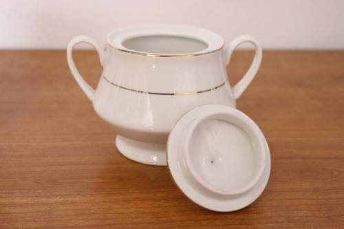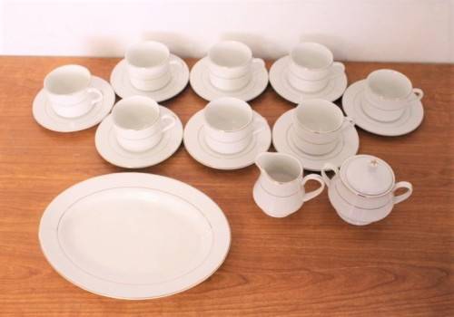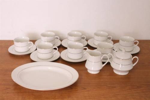 This stunning white with gold trim 8-setting porcelain tea service set includes a milk jug, lidded sugar bowl and an oval pastry plate. The tea set is in great condition and there are no visible chips or cracks in any of the pieces and there is absolute minimal tarnishing on the gold gilt. The tea set measures as follows; The cups are 11.5cm long (including the handle) x 8.8cm wide x 6.6cm high, the saucers are 16cm across, the sugar bowl is 14.5cm (handle to handle) long x 11cm wide x 12cm high, the milk jug is 11.5cm long (spout to handle) x 8cm wide x 10.5cm high and the pastry plate is 33.3cm long 22.5cm wide. Please note the pics have been taken with the flash on and the flash off to maximise the detailing. Please view the pics carefully to fully appreciate this wonderful white and gold tea service set and to confirm the condition. Please view the shipping options or request courier costs prior to purchasing any of our products.