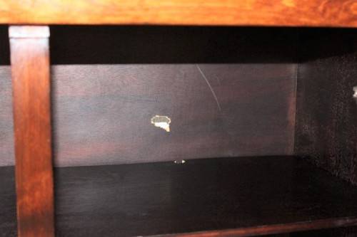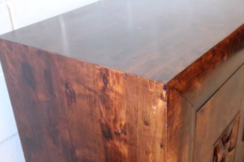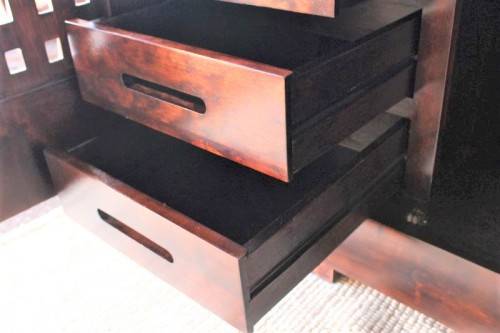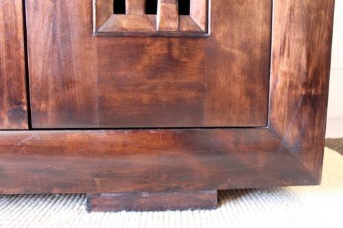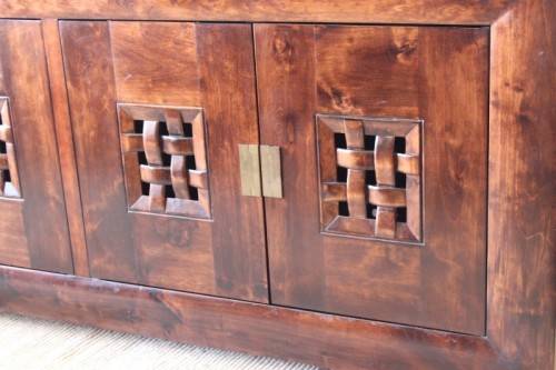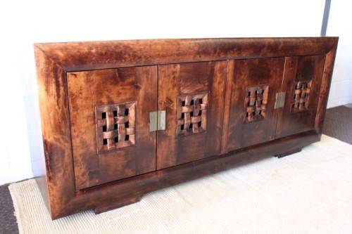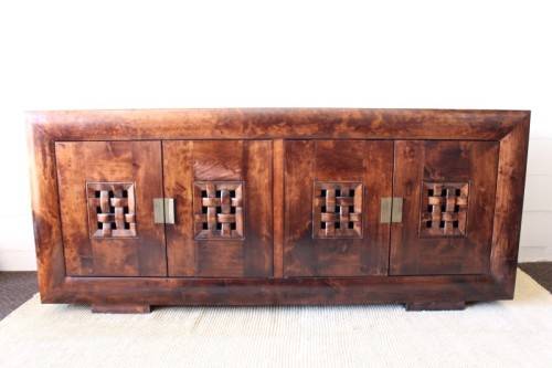 This superb and beautifully made top-quality original Coricraft Arc collection 4-door buffer/ side server/ cabinet with four storage drawers (behind the cabinet doors) and oriental styled brass handles measures a very decent 200cm long x 50cm wide x 85cm high. The server has two double door cabinets of which one has a row of four drawers with a full height cupboard and the second set of double doors has shelves. The server has a little/ normal wear and tear and scuffs etc, and is still in gorgeous condition. The server would look fantastic in a larger living or dining room or even a office or study. The cabinet would also make an awesome entertainment system with the TV on top and loads of space for entertainment components. The clean design of the Arc collection makes it a modern but classic collection that looks just as good in a modern home as it does in a slightly more classic decor. The grain of the teak wood is especially prominent in this server and is very striking and eye-catching - it is stunning! There are some minor scuffs on the top but not overly noticeable (see pics). Please view the pics carefully to fully appreciate this eye-catching Coricraft four door server cabinet and to confirm the condition.