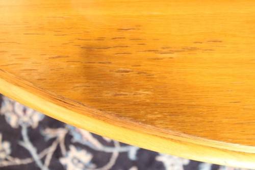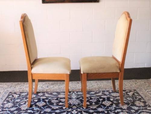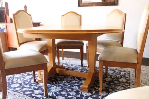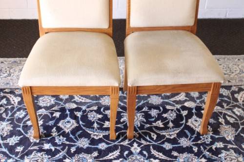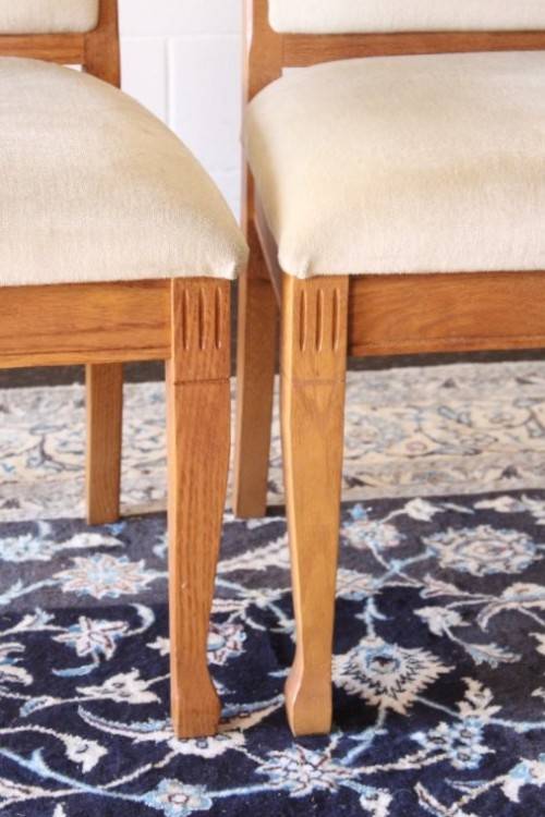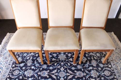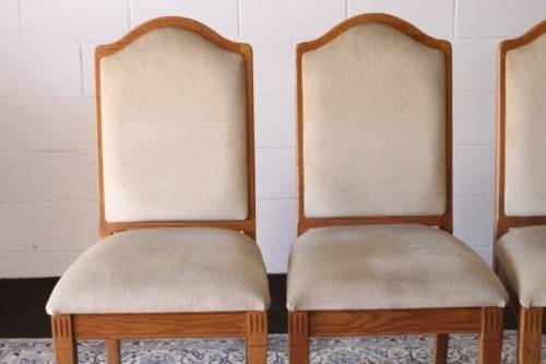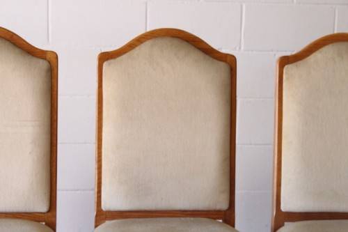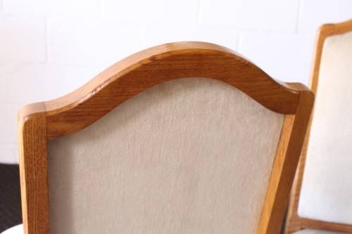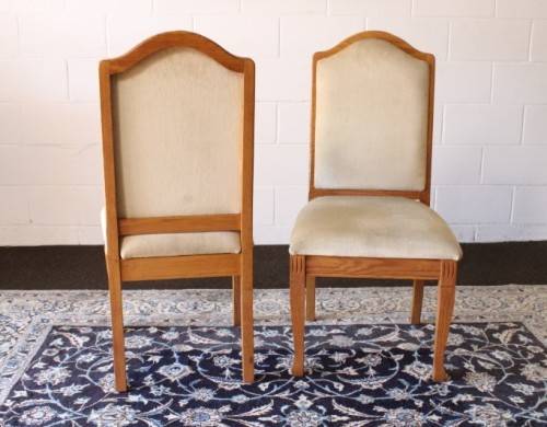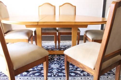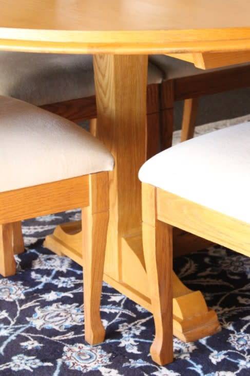 This wonderful vintage oak 6-seater extendable dining room table with six solid oak upholstered chairs. The dining room table measures 139cm across when closed and extends to 178cm when the fold-away extension is joined. The chairs are solid oak and are sturdy well made dining chairs which measure 49cm long x 50cm wide x 103cm high. The table is a solid oak and oak veneer combination. There is some age and usage related wear and tear and water stain/ damage on the one side (see pics). The chairs are upholstered in a off-white fabric and can be reupholstered to suit your decor. Please view the pictures carefully to fully appreciate this oak dining room suite and to confirm the condition.