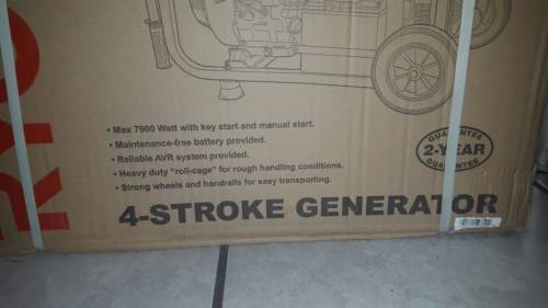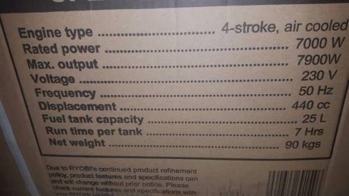4 Stroke air cooled engine. Rated power 7000W. Max output 7900W. 25L Tank capacity. Electric key start. Never exceed Max rated capacity.