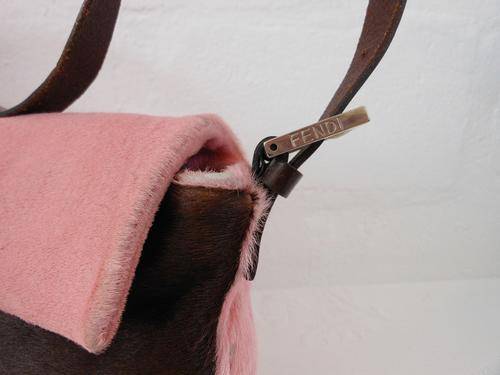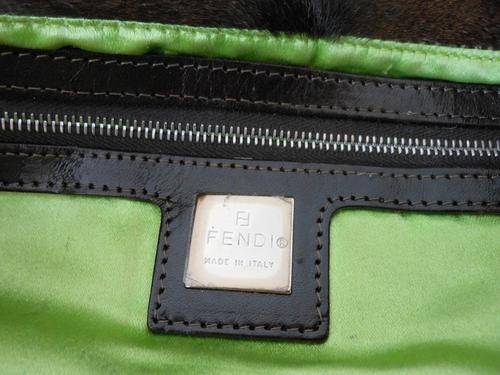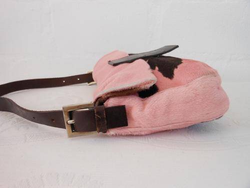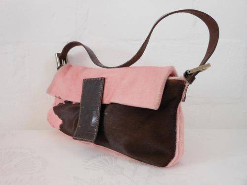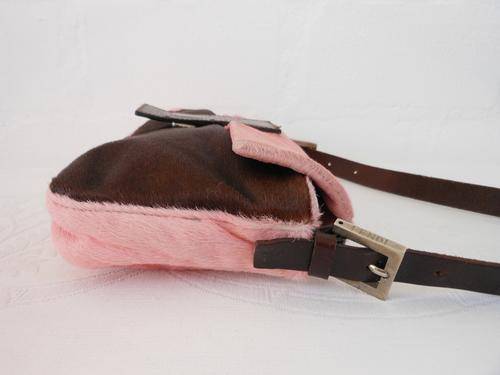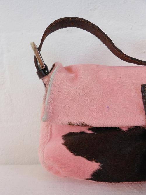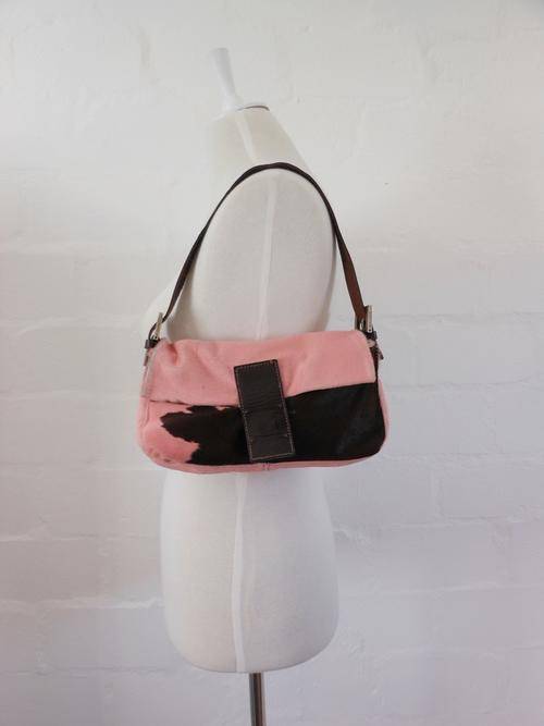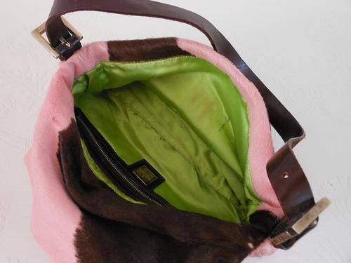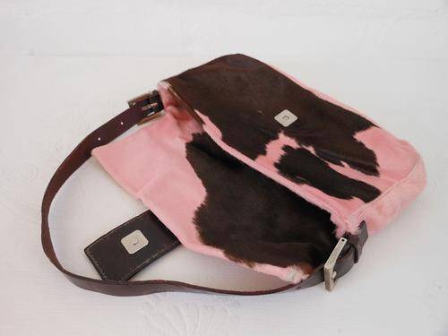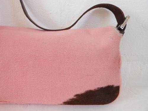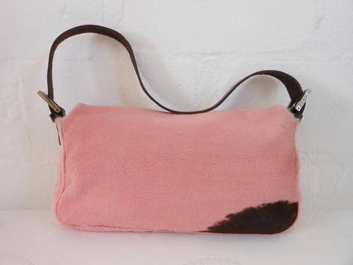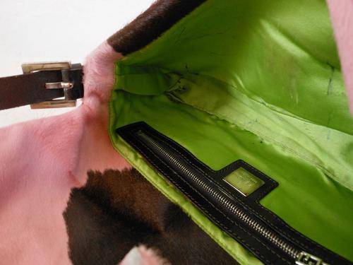 Stunning rare authentic FENDI luxury designer handbag in the brand's signature Baguette style. Made from a pink and brown calf hair, with leather strap and green satin lining. Signed "Fendi Made in Italy" plaque inside, buckles and magnetic clasp are signed "Fendi" and zip comprises of "FF" design - guaranteed authentic. Good condition, though showing some signs of wear i.e. some hair loss and soiling/ pen marks to lining. Possibly missing a "FF" metal logo on the front on top of the clasp. This particular design has been discontinued and are very hard to find. Bag measures 26 cm x 15 cm x 4 cm. Handle measures 49 cm (can be adjusted smaller).