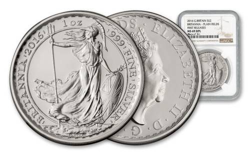 This 2016 Silver Britannia example is certified Mint State-69 Deep Proof Like (MS69 DPL) and First Releases (FR) by Numismatic Guaranty Corporation (NGC).