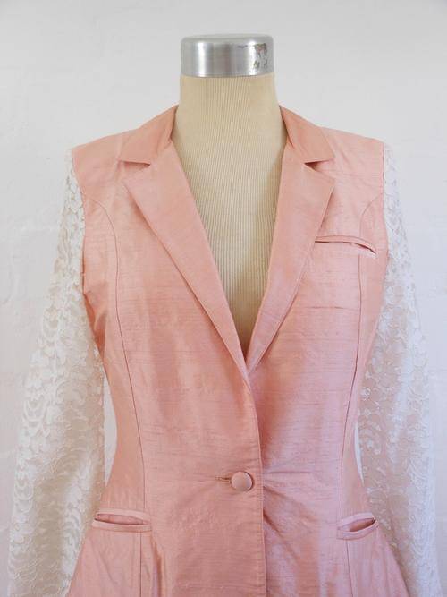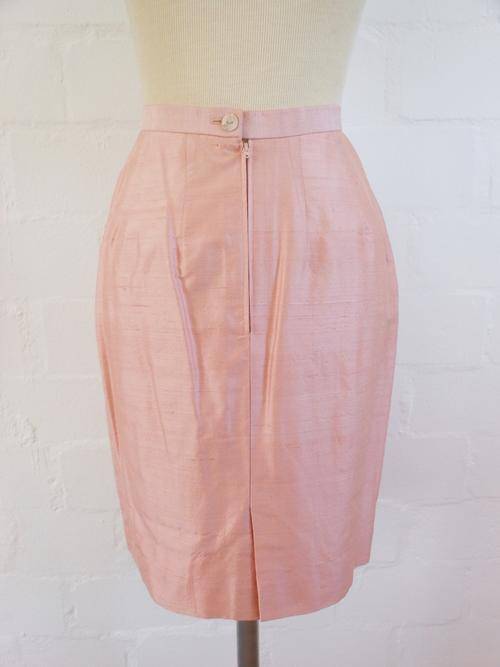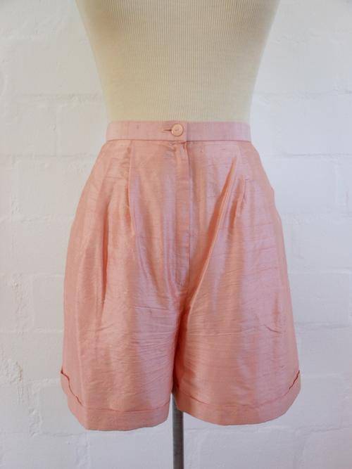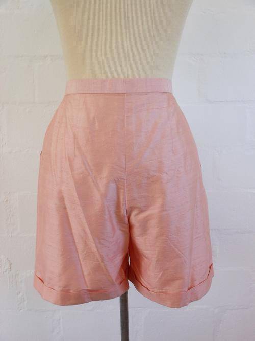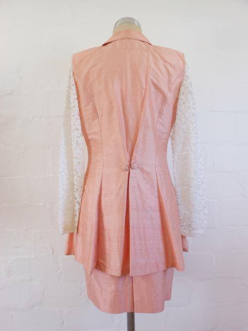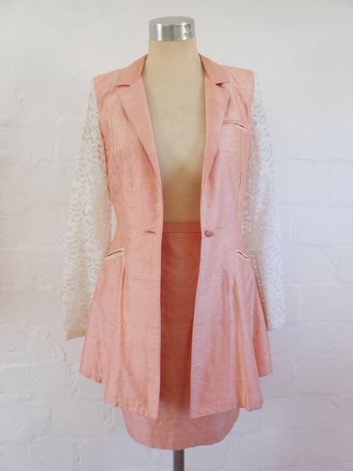 Lovely authentic vintage raw silk three-piece suit comprising of jacket with lace sleeves, high waist shorts and pencil skirt. Very good condition, though has not been dry cleaned and will need to be cleaned before wearing. Skirt and shorts will fit approx. size 4/ 28 (extra small), however jacket will fit up to size 10/ 34 (small-medium). Measurements of garments as follows: