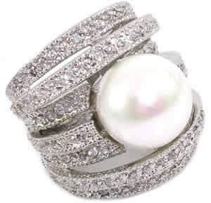 STUNNING SOFT WHITE SOUTH SEA PEARL SIZE - 14mm TREATMENT - COATED SPARKLING ROUND BRILLIANT CUT DIAMOND SIMULANTS Our designer style setting is plated in a semiprecious metal called rhodium. Unlike silver, rhodium will not tarnish or lose its shine. You will be very pleased with the top notch quality & workmanship on this ring. AMAZING DESIGN!! RING WIDTH - 23mm