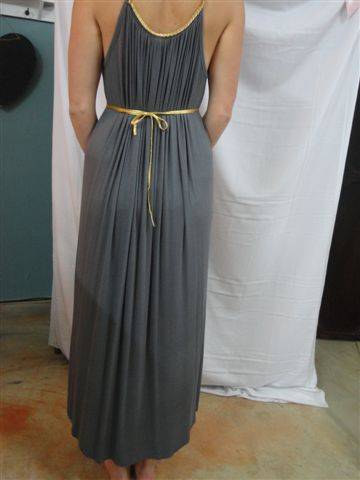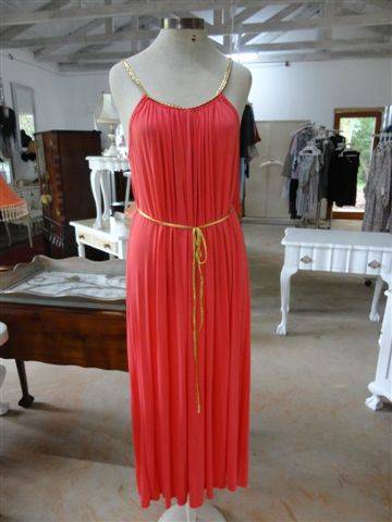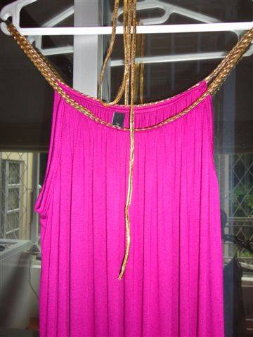 Gold rope edging and shoelace thin gold belt! Belt can be worn high up or on the waist. Dress can be pulled up and over the belt to shorten the dress to. Extrememly comfortable, cool and elegant.