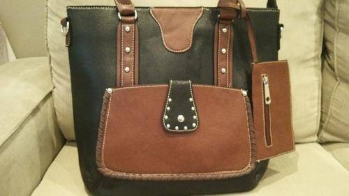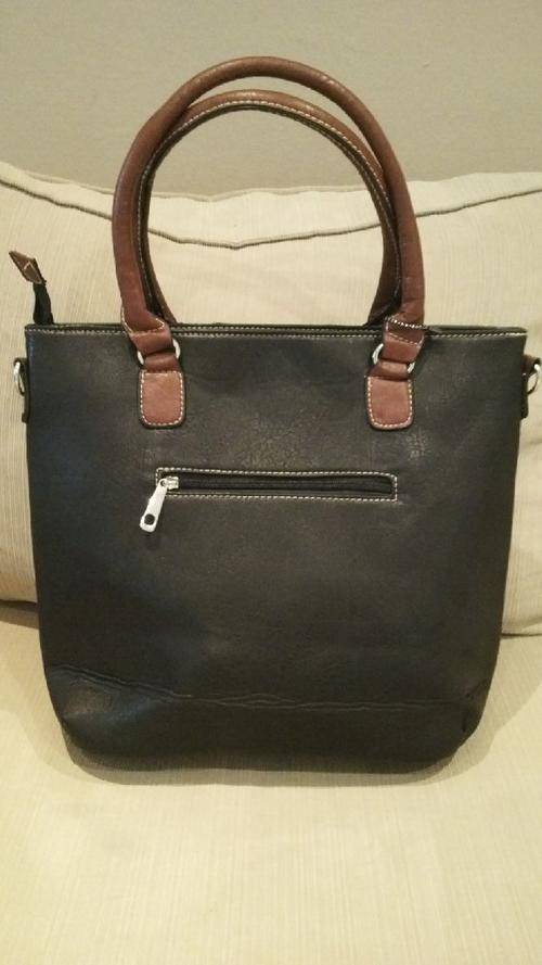 Stunning Ladies 2pc Black/Brown/Tan PU Leather Handbag With Beautiful Detail & Design... Has 2 divided sections, plenty of room for just about anything, has zippered compartments on the inside and sections for your cellphone, also comes with a detachable strap, so the bag can be carried sling style, also comes with a coin wallet, great piece...