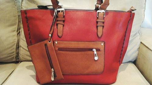Stunning Ladies Red/TanPU Leather Handbag, this bag is huge and can also be used as a travel bag, it has 2 divided sections on the inside of the bag allowing plenty of storage, has zippered compartments on the inside of the bag and a cellphone compartment, comes with a coin wallet or this can be used for anything you like, Beautiful Piece!!!