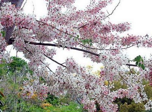Pink flowers, which resemble the yellow flowers of the Indian Laburnum, appear as if the long branches