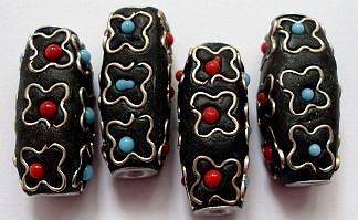 4x 10x27mm Kolhapuri Focal Beads,with Coral & Turquoise inlay