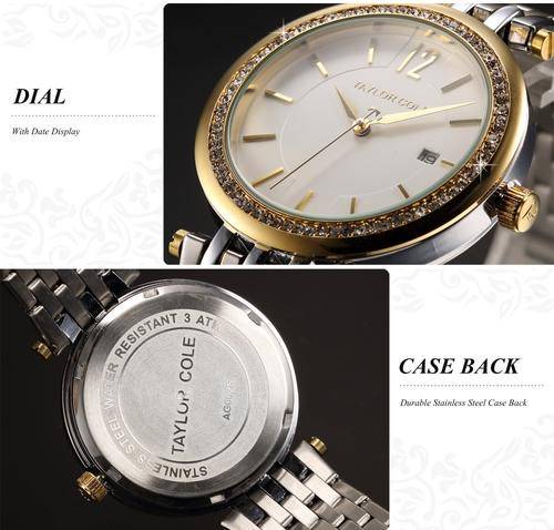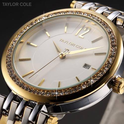 ***Taylor Cole Lady Silver/Gold Steel Band Bracelet Luxury Crystal Date Women Watch*TOP Brand