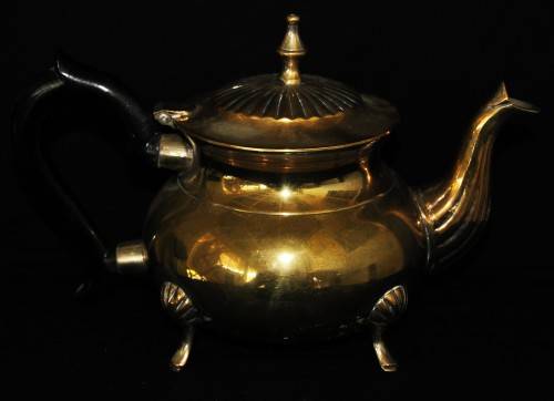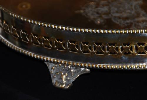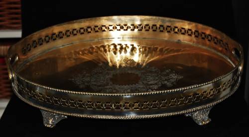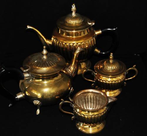 NOTE: LOT INCLUDES THE FOLLOWING : 1 X LARGE FOOTED GALLERY TRAY , 1 X COFFEE POT , 1 X TEA POT , 1 X SUGAR BOWL WITH LID AND 1 X MILK JUG .PLEASE TAKE NOTE THAT THE SET HAS NO DAMAGE BUT THE SILVER PLATING IS ALMOST COMPLETELY WORN DUE TO AGE , EXPOSING THE BRASS UNDERNEATH .THE SET THUS LOOKS MORE GOLD THAN SILVER IN COLOR .. IT IS STILL A VERY BEAUTIFUL SET , THE GALLERY TRAY FEATURES BEAUTIFUL ENGRAVINGS .
