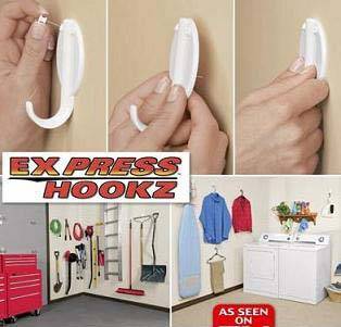 ***GENIUS IN INGENIUS*** ***EX PRESS HOOKZ*** ***SET OF 8 pcs - HOLDS UP TO 45 POUNDS*** Express Hookz organize, decorate and eliminate household clutter! Patented 4-point anchor system mounts in a flash onto almost any drywall surface - no tools needed. Position on wall, press into place and hang! Each hook supports up to 45 lbs. Completely removable and repositionable. Set of 8. Be creative and use these hooks any where you would use a nail or screw in the wall. With your Express Hooks you will now have a place for everything, and everything right in its own place! Express Hooks are only intended for use on drywall, thin paneling or cork board. May be used on carpeted work cubicles. DO NOT attempt to install into studs as it will not properly install or support weight.