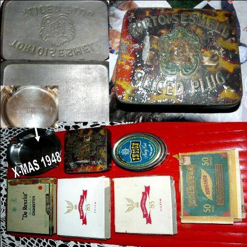 *****VERY COOL - VERY VINTAGE. FOR THE vintage items COLLECTOR OR FOR THE "VINTAGE CIGARETTE/PUB DISPLAY"/MAN CAVE - COLLECTION OF OLD TOBACCO SMOKING TINS/boxes and 1948 XMAS Ashtray - BID FOR ALL (LOT)*****