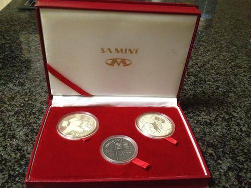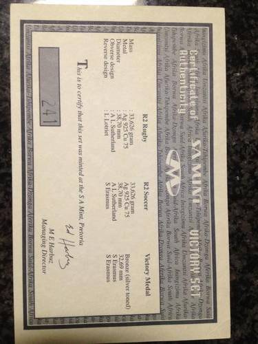 The 1995 Rugby World Cup Victory silver proof together with the 1996 celebrated African Cup of Nations Soccer Victory silver proof coin and the Victory bronze medallion.
