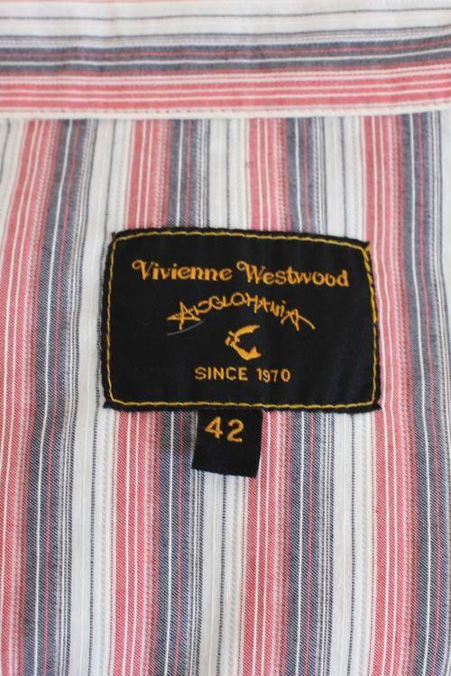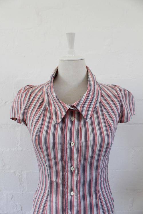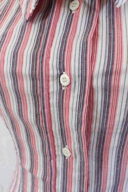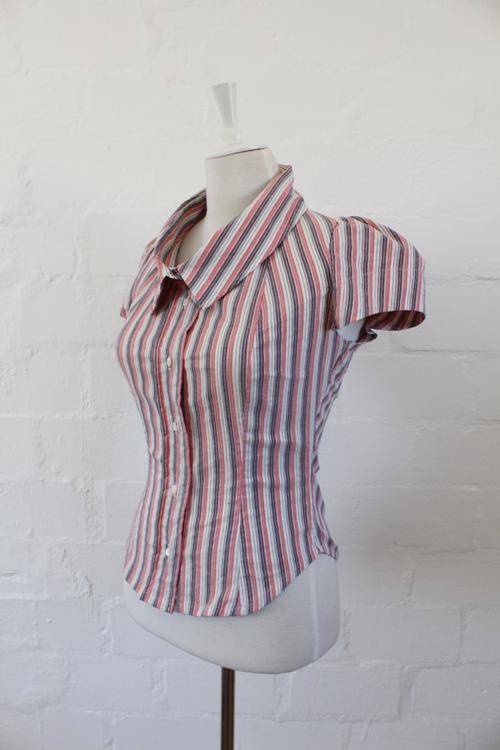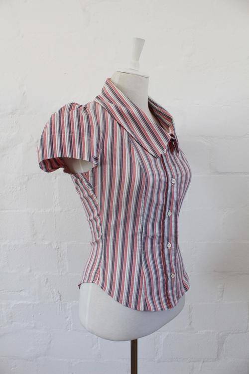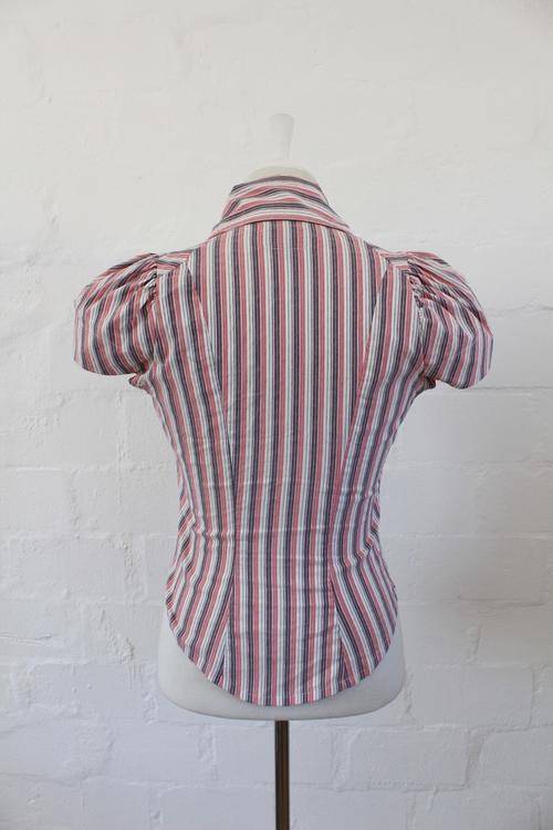Stunning authentic Vivienne Westwood Anglomania red, blue and white striped shirt with puffed cap sleeves. Made in Italy. Made from a stretchy, quality fabric - very form flattering.