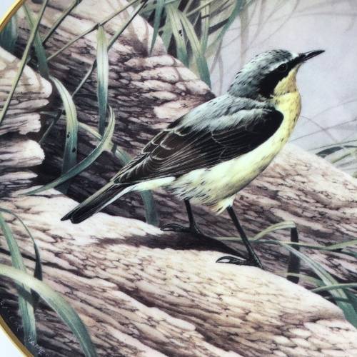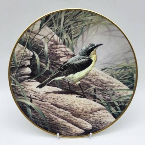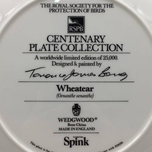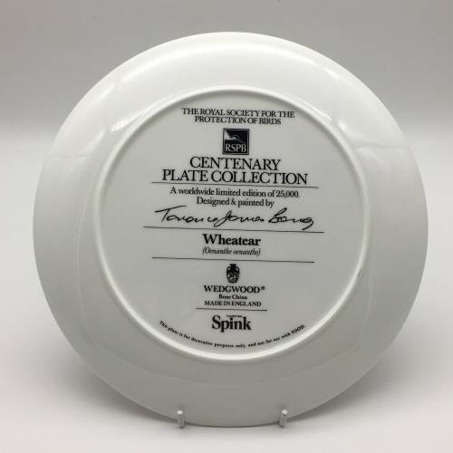 This lovely, fine bone china bird plate featuring a 'Wheatear' bird in its natural surroundings, is a picture from the original which was designed and painted by 'Terence James Bond'. The plate was produced in England by the 'Wedgwood' factory in a limited edition and is part of the 'Centenary Plate Collection' for 'The Royal Society for the Protection of Birds' (RSPB). The plate is in excellent condition and measures 23cm in diameter.