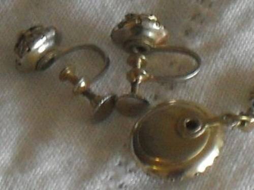 ...my camera is unable to capture a clear and justified photo for this stunning set...1x cameo set on a blue material (plastic?) for pendant and 2x set on same material for screw on earings. The cameos are surrounded by glass / stone????(non missing). The metal has no markings to indicate gold or silver but it is metallic my humble opinion it seems to have been silver plated, as where there is wear brass is showing through. Metal is non-magnetic.