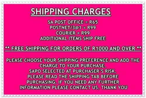 R35.00 Standard shipping using one of our trusted couriers applies to most areas in South Africa. Some areas may attract a R30.00 surcharge. This will be calculated at checkout if applicable.