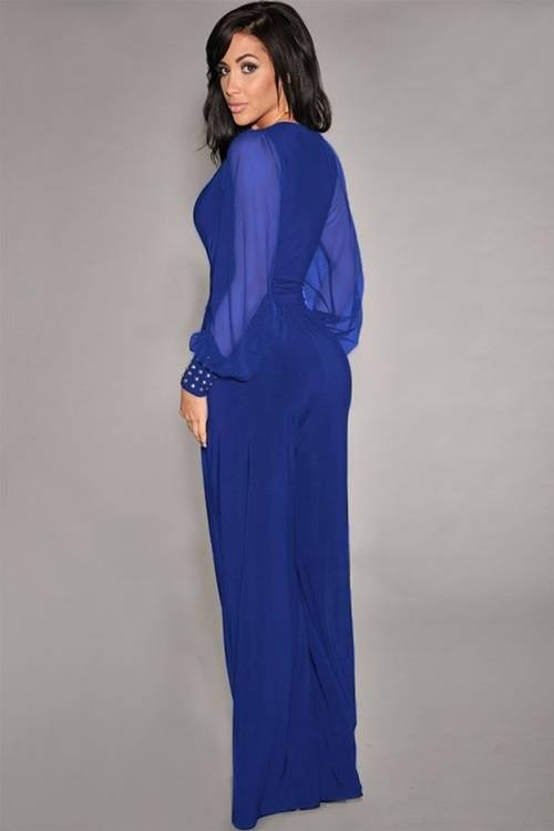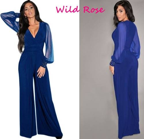 *WILD ROSE* *LOCAL STOCK* Blue Embellished Cuffs Long Mesh Sleeves Jumpsuit - 2XL