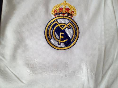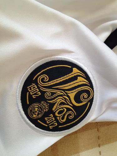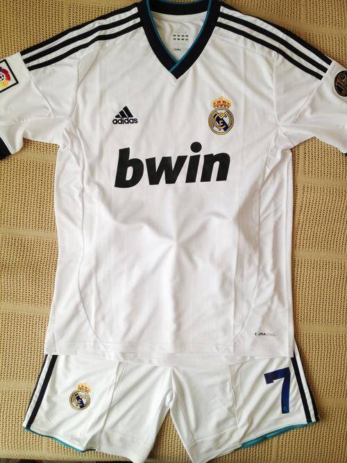 A traditional all white offering is complemented by Aqua and Navy piping and Adidas three stripes running along the shoulders. The Real Madrid badge is positioned on the left chest whilst the bwin sponsor is boldly printed in black across the middle. For an additional splash of colour, the LFP badge is stitched onto the right sleeve whilst a commemorative 110th anniversary navy and gold badge adorns the left sleeve.