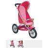 THIS JOGGER HAS SAFETY BELT FOR DOLL AND FOLDS DOWN COMPLETLY WHEN NOT IS USE. PINK IN COLOUR. WHITE & PINK WHEELS!