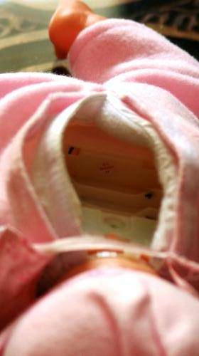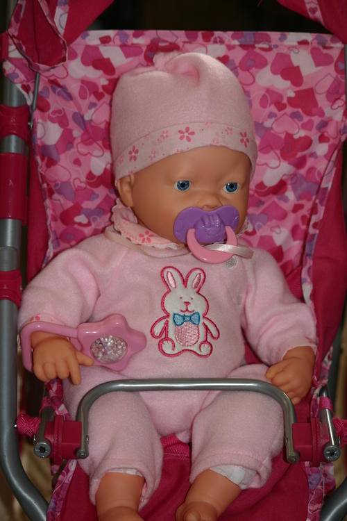 DOLL IS BATTERY OPERATED AND EYES MOVEMENT ACTIVATED WHEN DUMMY IS PLACED IN MOUTH: EYES OPEN AND CLOSE.