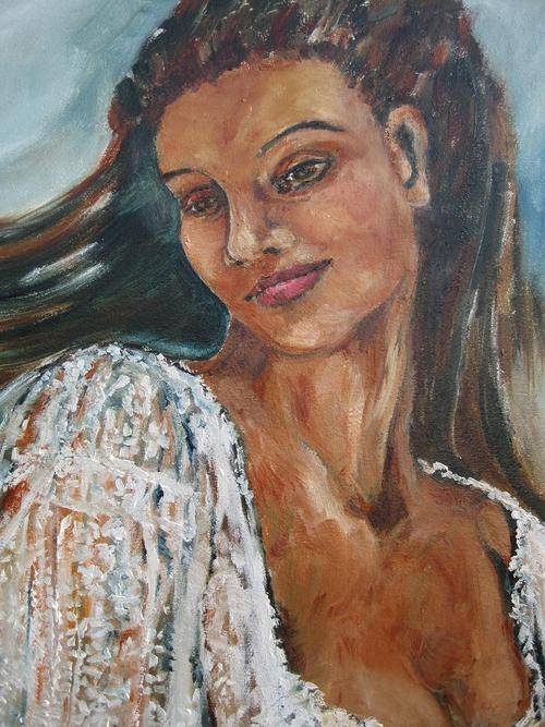 A beautiful painting of a young woman in a lace dress. Texture of lace visable!This colourful painting has been painted in an impressionistic way and has been sealed with varnish to enhance the colours.