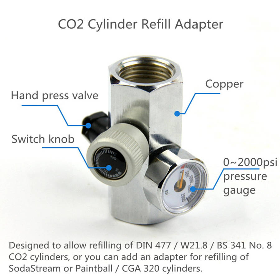 Features - Integrated pressure gauge for safety. - Dump valve for safe and controlled release of gas. - Used to safely refill cylinders from larger donor cylinders. - With a dump / purge valve to safely release the residual gas within the adapter once refilling is completed. - Includes a pressure gauge to ensure the pressure of the donor cylinder will not exceed the pressure specification of the recipient cylinder. - Designed to allow refilling of DIN 477 / W21.8 / BS 341 No. 8 CO2 cylinders, or you can add an adapter for refilling of SodaStream or Paintball / CGA 320 cylinders.