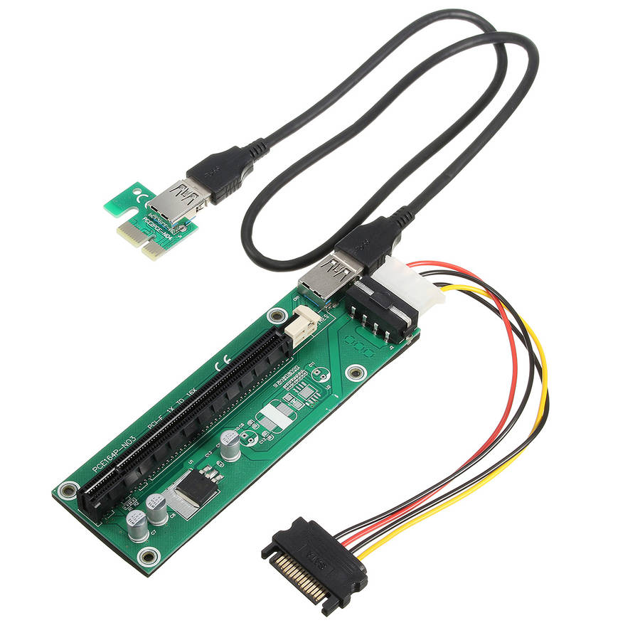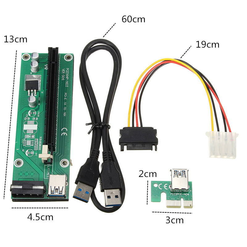 1. PCI-E 1x to 16x Mining Machine Enhanced Extender Riser Adapter With Power Cable 2. With power cable and USB 3.0 cable, Digging Preferred, Stable anti-burn 3. More safer, more efficient, more practical 4. Safer, more efficient, more practical 5.The graphics card power supply independent from the motherboard, which to reduce the burden on the motherboard when connect multi-graphics card 6. Solve the problem that welding point fragile burn, transmission signal attenuation, platoon line length is not enough and so on 7. Slots with fixed card buckle, remove the graphics card and the fixed graphics, the graphics card will not fall off from the slot 8. PCI-E connector with multi-layer shielded wire, the longest can connect 3 Meters the signal will not attenuate 9. With 3x solid capacitors, making graphics power supply more stable and secure. 10. With SATA 15pin Male to big 4pin power cable, strengthen power supply, so that graphics power from the motherboard independent, so multi-card reduce motherboard burden. 11.The PCI-E connector with multi-layer shielded wire, the longest can be connected to 3M without attenuation signal 12.The gold-plated PCI-E connector is Wearable and will increase the conductivity 13. PCI-E 16x slot with lock for easy removal and fixed graphics card, so that graphics will not fall from the slot.