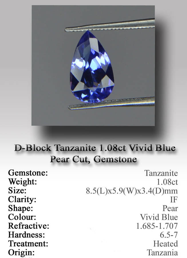 1.08CT D-BLOCK TANZANITE, VIVID BLUE, PEAR CUT, 8.5(L)x5.9(W)x3.4(D)mm, TANZANIAN GEM, IF