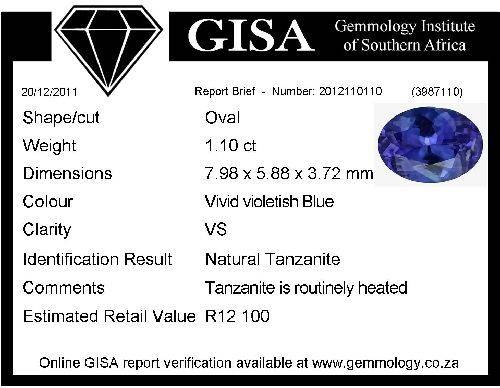1.10ct - Oval VS - Vivid Violetish Blue Natural TANZANITE - GISA CERTIFIED (R12100.00)