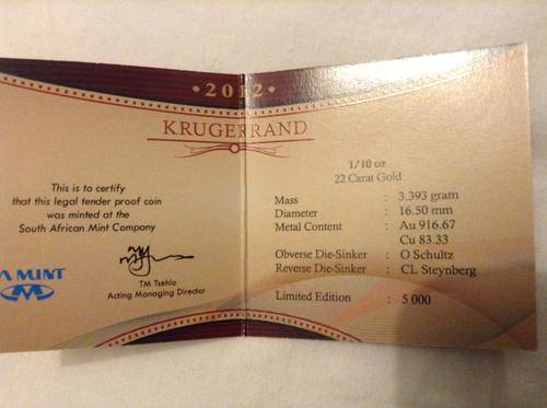 1/10 OZ Proof  22 Carat Gold Kruger Rand. Limited Edition Only 5000  minted