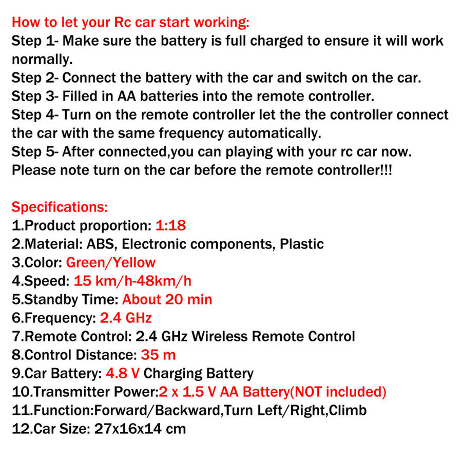 | Transmitter | Frequency: 2.4G | Battery | Battery:Li 4.8V 600Mah Transmitter battery:2x1.5AA(not included) |