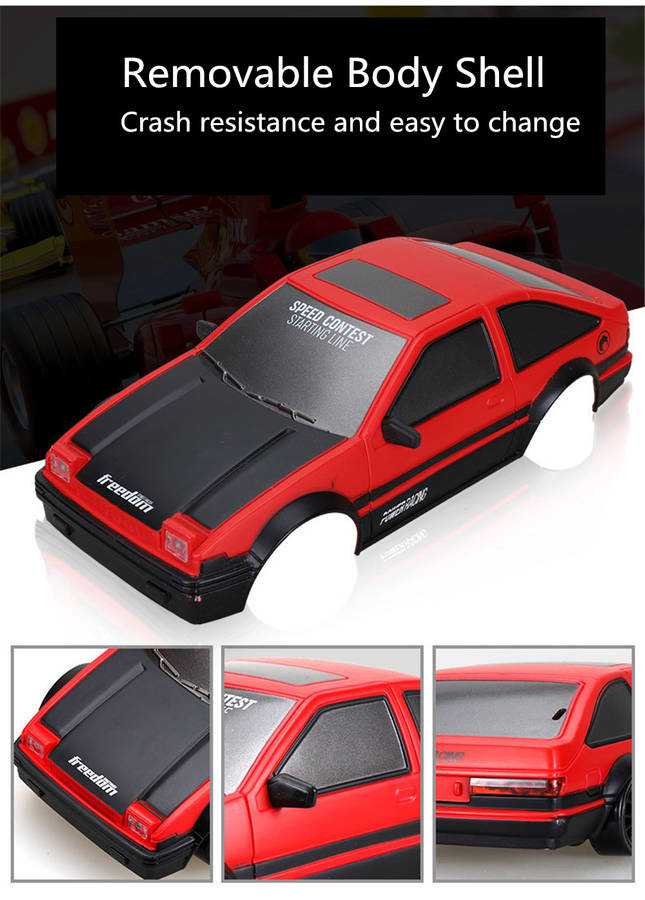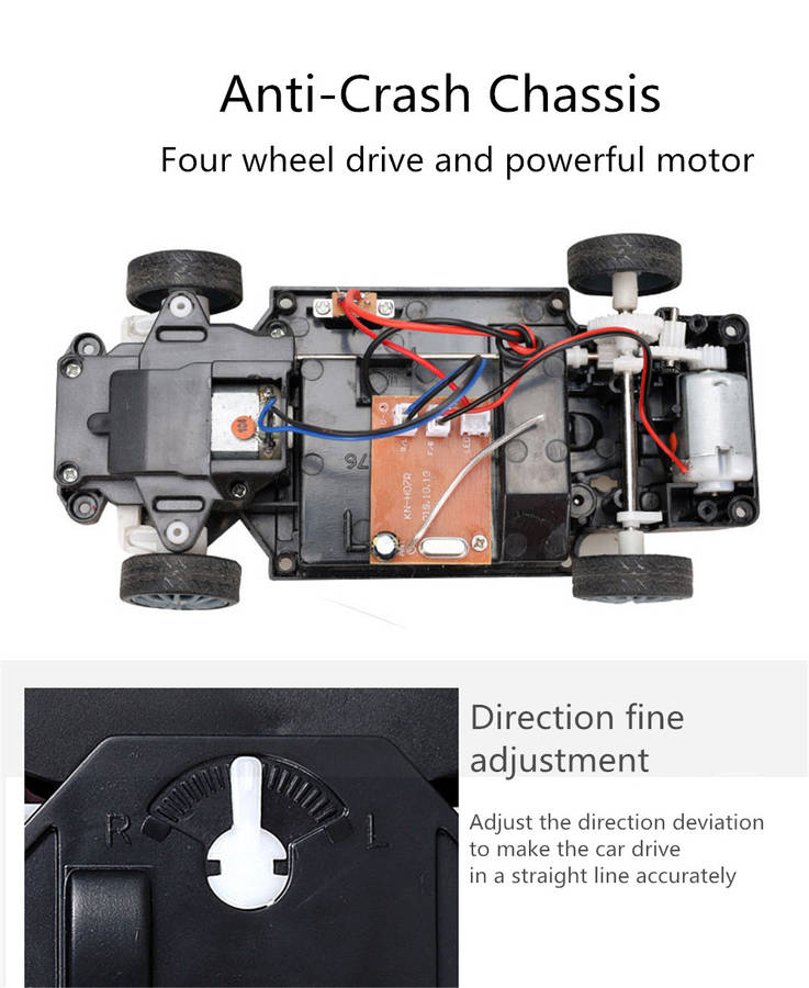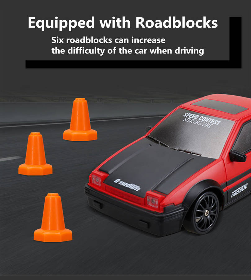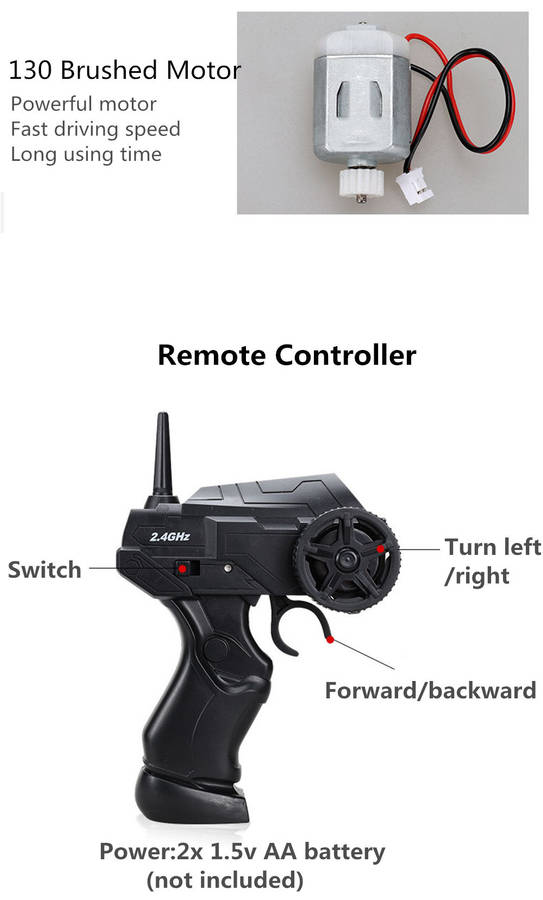 | Basic?information | Type:Drift Car Scale:1/24 Color:Black,red,yellow,blue,orange and grey Max Speed:15km/h | Power System | Motor:130 brushed motor |