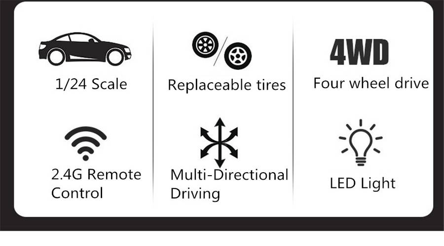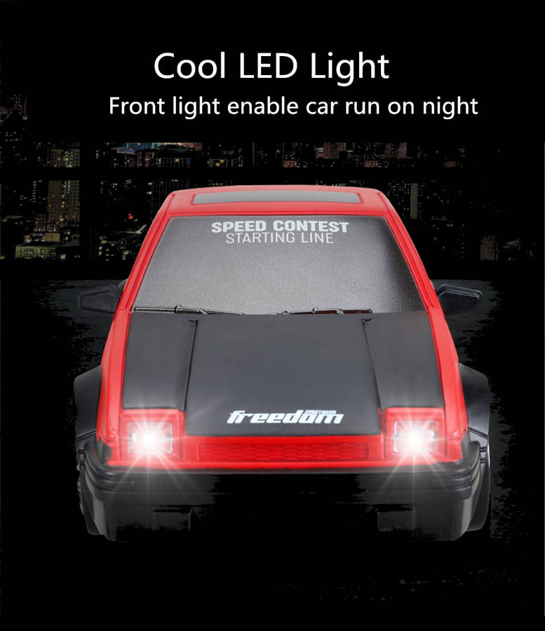 Move forward,backward,turn left/right,front LED light,drift,four wheel drive