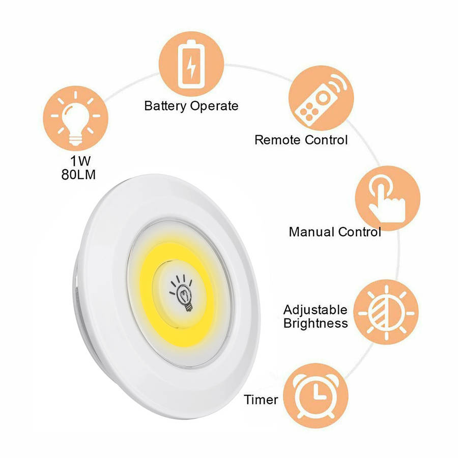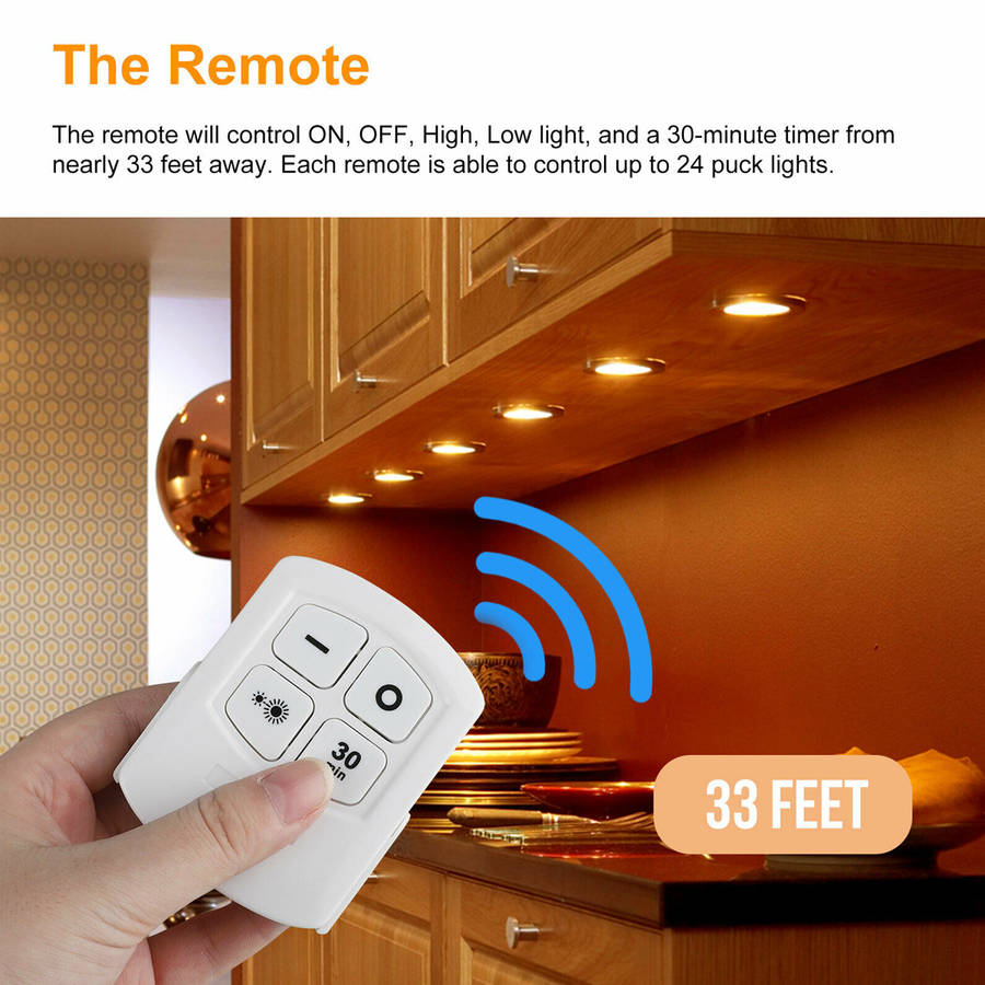 Easy to UseThe remote for the COB touch light is easy to use. Powered by 2 AAA batteries, the remote will control ON, OFF, High, Low light, and a 30-minute timer from nearly 33 feet away. The COB puck light allows you to use as many remotes as you want with each light. Each remote is able to control up to 24 puck lights.