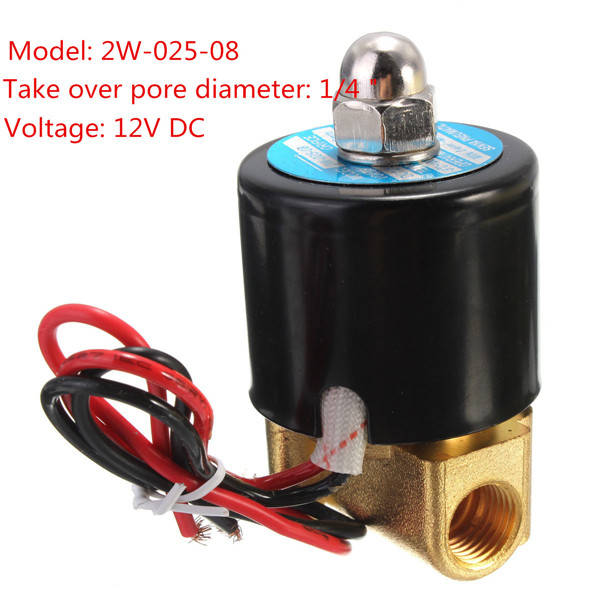 Solenoid Valve Model : 2W-025-08 Body Material : Brass Working fluid : air, water, oil Type : normally closed Take over pore diameter : 1/4 Flow pore diameter : 2.5mm Seal Material : NBR Voltage : 12V DC?? Pressure range : 0 - 1.0Mpa Fluid temperature : -5 - 100 a??