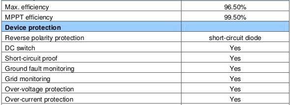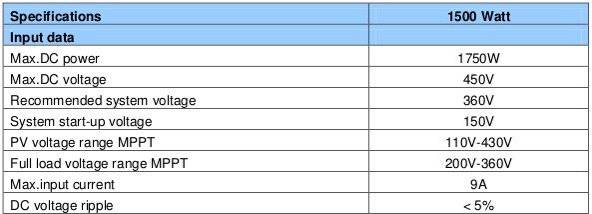 Overview: The 1.5kw inverter can be used in a small commercial grid-connected system. This inverter has two MPPT trackers and three-level technology which includes boosting for low panel voltages, giving the inverter a very wide input voltage operation. Using transformer-less technology, efficiencies of greater than 95% can be achieved. The technology uses High Frequency Pulse Width Modulation (PWM) to regulate the output of the inverter.