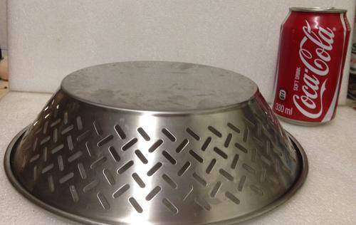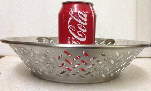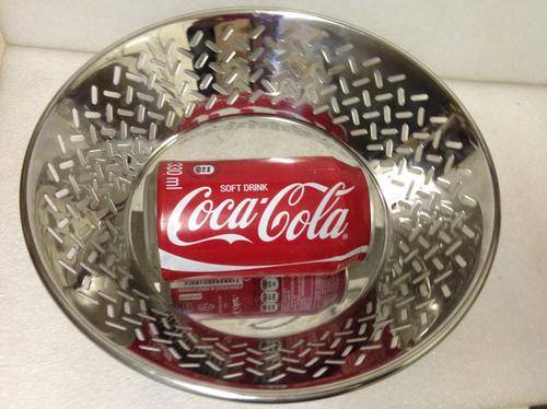 STAINLESS STEEL BOWL WITH CUT-OUT GRAPHIC RENDERING OF BASKET WEAVE -ICONIC 1981 DESIGN BY ETTORE SOTTASASS FOR ALESSI-OPEN BASKET WEAVE FRUIT BOWL -FLTEX BACTERIO -ICONIC ITALY