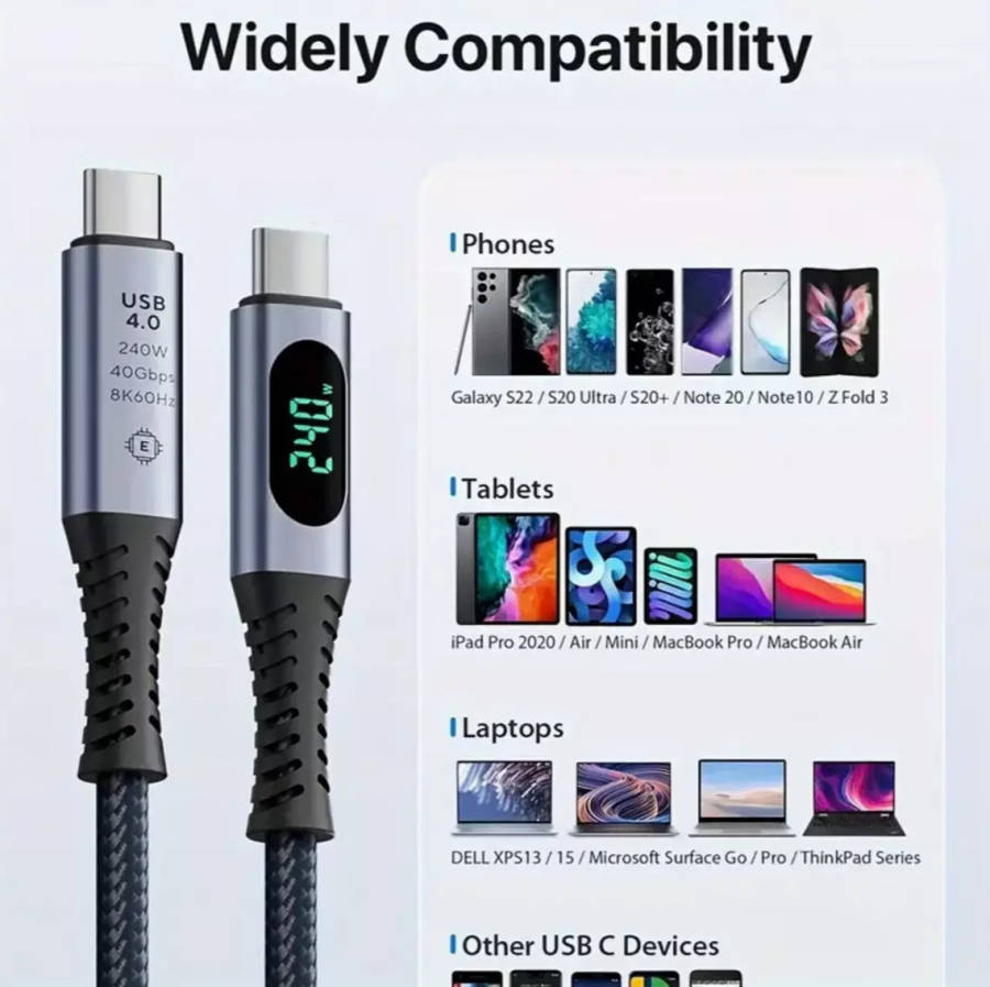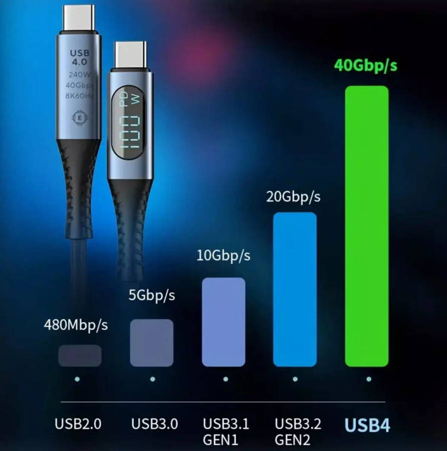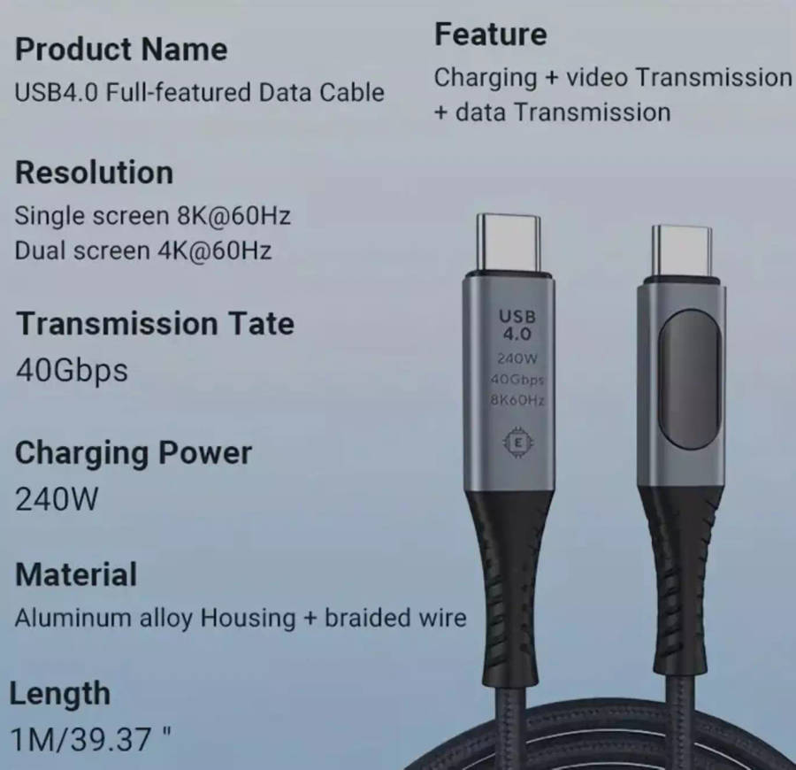 This cable has the same features as Thunderbolt 4 and Thunderbolt 5 USB C Cables, please see technical details of USB C Cables as at https://www.hdcabling.co.za/usb-1-1-vs-usb-2-0-vs-usb-3-0-vs-usb-3-1-vs-usb-3-2-vs-usb-4-0-usb-type-c-3-1-3-2-gen1-gen2-thunderbolt-3-vs-thunderbolt-4-specifications/