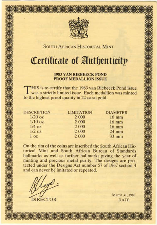 Limited issue of 2000, this is a PROOF 22 carat gold medallion struck at the SA Mint. Still in original box (excellent condition) and complete with certificate of authenticity from the SA Mint. A real collectable.