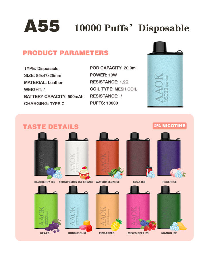 A55 is a large capacity disposable e-cigarette with adjustable valve at the bottom of the device. AAOK A55 10000 Disposable Vape features a 20ml prefilled e-liquid, rechargeable 500mAh battery, 1.0 ohm mesh coil, and 5%(50mg) nicotine strength for approximately 10000 puffs. You can even adjust the content of your order from 0 to 5% nicotine. The super liquid content and professional e-cigarette equipment provide you with 10,000 puffs top taste experience. Adopting a double-layer design, the inner coating of the mouthpiece has a "V" design, so you can see more clearly whether there is condensation. Despite the transparent case, it has non-slip sides to ensure a good grip for up to 10000 puff count. The size of the device that fits the palm of an adults hand and the setting of the non-slip strip on the side of the device are each part of the designers unique intention.