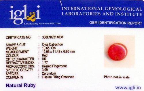 10.65 Ct Certified Oval Cabochon Ruby - IGLI Certified 12mm Stone for Jewellery Mounting