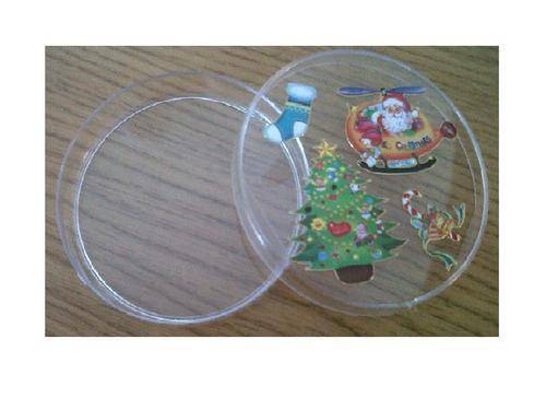 10 beautiful christmas decorated plastic cointainers, 1.5 cm deep and diamater of 9cm. These can be hang on the christmas tree, placed on your table as decorations or when filled with goodies, given as small gifts to your guests