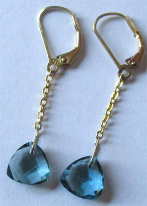 A pair of 10ct gold, stamped 10k and genuine London trillion fancy cut blue topaz earrings .