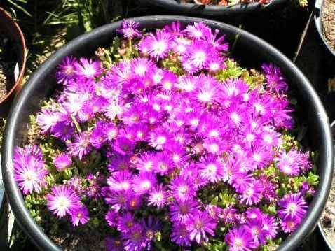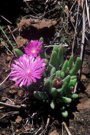 A sprawling free branching subshrub succulent with bright green glacous leaves and silken purple or pink flowers.