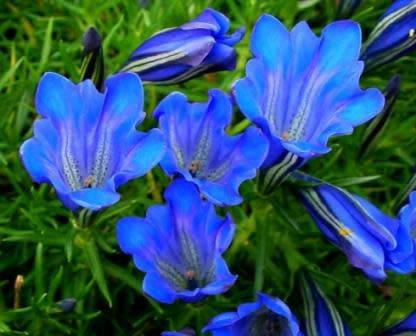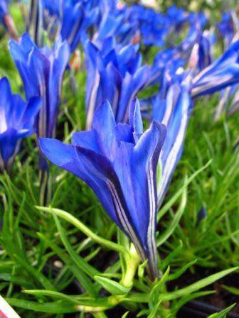 Gentiana 'Blue Silk' is a perennial with trailing stems, to 20cm in length, bearing narrow leaves and upward-facing, funnel-shaped, purple-blue flowers with lighter and darker stripes. Grow in moist but well-drained, neutral to acid, humus-rich soil in partial shade. Suitable for a rock garden or peat terrace.