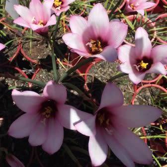 Habranthus is a genus in the Amaryllidaceae family with species from Central and South America extending into southern North America. All of them have narrow, linear or strap-shaped leaves. Their flowers are very similar to Zephyranthes and both are called rain lilies because they flower in profusion after a rain shower during summer. Habranthus brachyandrus jumbo is a relatively hard-to-find rain lily that has flat green foliage, similar to Habranthus robustus. Each flower can be up to 10cm long. The contrast of the outfacing pink flower with the dramatic purple throat is outstanding.
